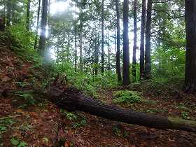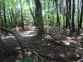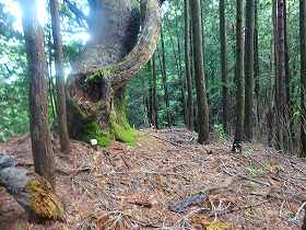 急峻な斜面を直登していったらピーク部に到達した。これが1郭である。といっても自然の急傾斜以外には城郭加工は感じられず、ほぼ自然地形のピーク部といった印象である。ここにはかなり古そうな古木が立っていた。