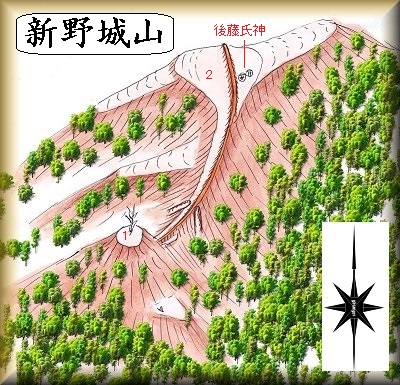 北側の部分がかなり広くなっており、そこが2郭である。もっとも自然の傾斜地形もあり、やはり城の郭といったものではない。土塁を挟んで2の東側部分に氏神様が2基祭られていた。山麓の後藤家のものらしい。