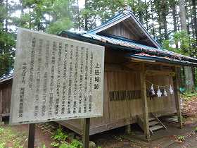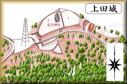 阿南少年自然の家から北側に降って行ったところにある比高140mほどの山稜先端部の名方神社が上田城の跡である。城址の手前には鉄塔が建てられているので、これが目印になる。