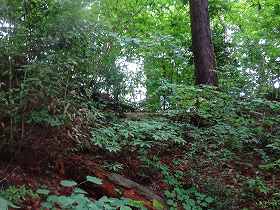 そこから北側に降りていくと尾根が長く続いている。この尾根の東側部分が土塁状になって長く延びている。といっても、城の土塁といった印象は受けない。地域によっては、山の上に土塁を設置して土地の境界を示していることがあるが、これはそれと同じようなものであろうか。