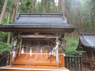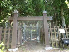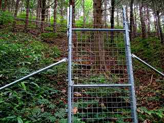 山稜の周囲には獣除けの鉄柵が巡らされている。よく見ると神社右手背後の所に出入り口があった。それを開けて山稜に取り付いて行った。