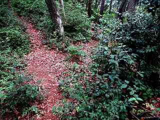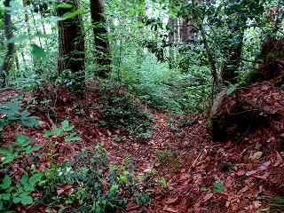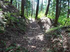 | 2郭南側の堀切。重ね城に行く場合は、この堀底を通って、南側の遊歩道に進んでいく。 | |