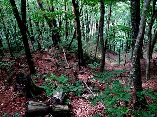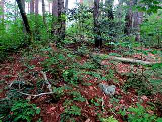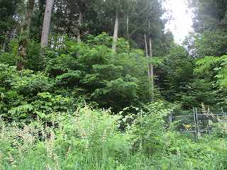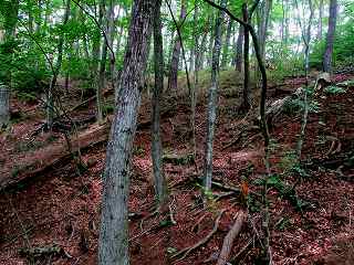 | 20分ほど歩いて1郭北側の大堀切の所まで来た。右手が1郭で左手が5郭。ここからの1郭城塁jは10m以上あり、けっこう高い。 | 1郭内部は整備されていない。入山禁止の張り紙があるが、山菜取りのシーズンでなければ大丈夫のようだ。 |