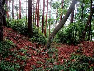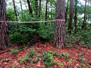 ところが、ここからどう進んでいけばよいのか分からない。仕方がないので1郭城塁を直登したのだが、けっこうな高さがあった。そうしてやっと1郭内部に入り込む。内部には特に案内も何もなく整備もされていない。唯一あった張り紙は「入山禁止」というものであった。しかし、張り紙をよく見てみると、入山禁止にはシーズンがあるようで、マツタケの季節以外は大丈夫そうである。それに自分が持っているのは図面だけで、キノコなど取る気はさらさらない。第一、私はキノコが大嫌いである。キノコ鍋など食べている人の気が知れない。