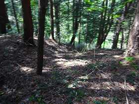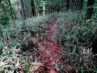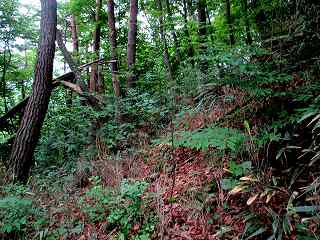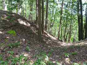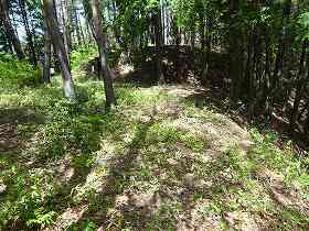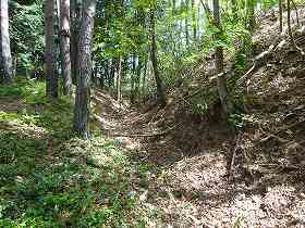 | 登るときには上の遊歩道入口が分からなかったので、山麓の五社神社に車を停めて、神社の入り口脇辺りから取り付いて行った。こちらが大手道であるとのことだったが、かなりの笹薮である。それでも進んでいくと4郭手前の堀切に出た。 | 4郭の先の二重堀切の外側部分。 |