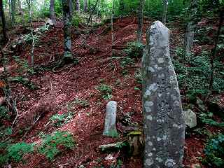 | 竪堀の畝の先端の1つには何かの石碑が建てられている。 | 畝状竪堀だが、写真だとよく分からない。 |