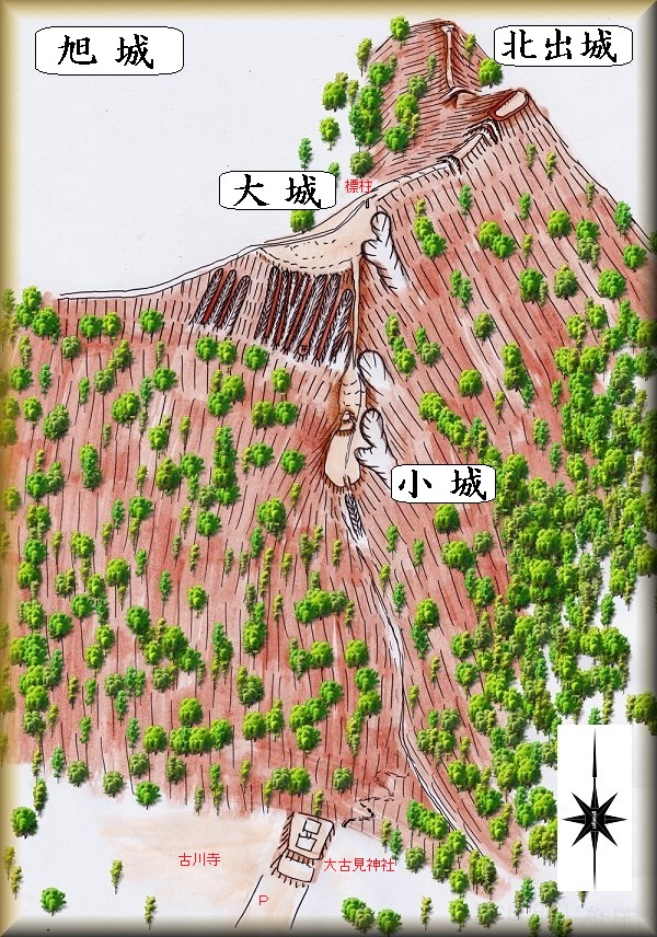 朝日村古見にある古川持や大古見神社の背後にそびえている比高200mほどの山稜が旭城の跡である。