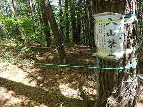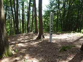 尾根を登って行くと平場に到達する。ここが大城であり、東西に80mほどと、かなりの平場面積がある。この東端辺りに、朝日村が設置した「旭城跡(大城)」と書かれた城址標柱が立てられていた。