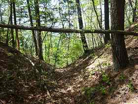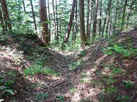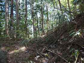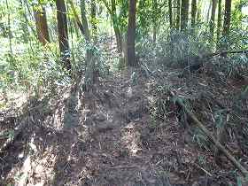 | 1郭南側の堀切。 | さらに進んで2郭南側の堀切。ここから側道を通って、来た途中のルートまで戻っていける。 |