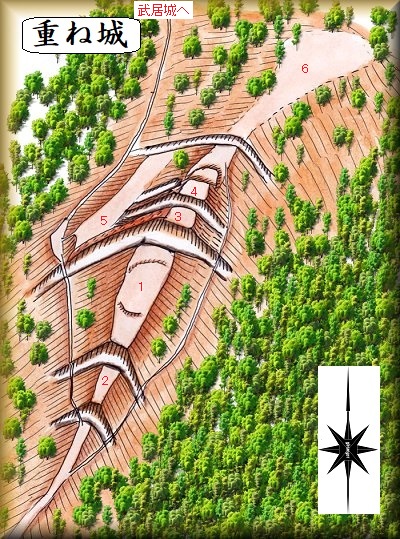 重ね城には大規模な堀切が見られ、そこそこの見どころがある。堀切の規模はそこそこ大きく、山城のセオリー通りに築かれた城郭であるが、武居城とは異なり、それほど技巧的な構造は見られない。こちらは戦国末期の改修は受けていないのではないかと感じさせる。