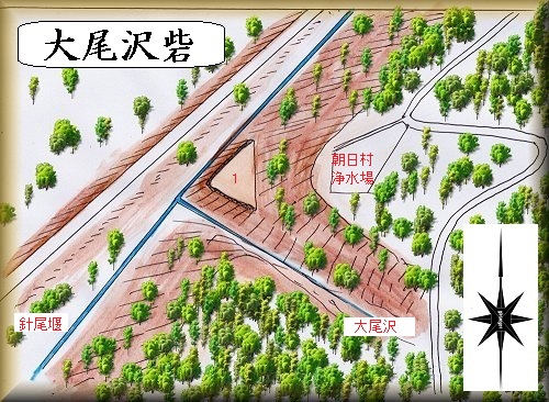 朝日村浄水場の西側の土手の途中にある三角形の空間が大尾沢砦の跡であるという。