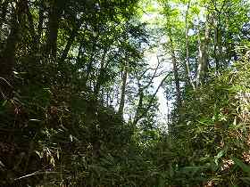 | その先にある1郭手前の大堀切。笹薮だらけである。 | 城塁をよじ登って、1郭下の腰曲輪の所に出た。ここから先はきれいに整備されている。 |