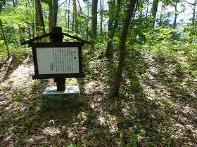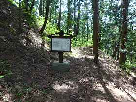 登城道はここに上がってくるように付けられていた。登城道もしっかりしているし、何より、遺構ごとに案内板が立てられている。よほど気合を入れて整備しようとしたのであろう。朝日村はなかなか頑張っている。正規の登城道から登り、案内に従って遺構を見たなら、整備された見やすい山城だと感じたことであろう。いやいや、最初に笹薮の海を通り抜けてきたからこそ、1郭周辺の遺構により感動できたのかもしれない。