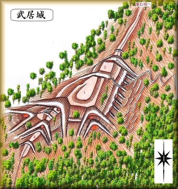 | 武居城は三村氏の居城であった。三村氏については平安時代からさまざまな伝承を持っているのだが、どこまでが真実なのかはよく分からない。 戦国期には武田氏に組み込まれていったと考えられるので、そうした時期に武居城も改修を受けているのであろう。 |