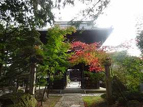 西側の参道入口に、安曇野市におなじみの城址標柱と、山門の案内板とが立てられている。そのまま進んで行くと正面にくだんの山門が見えてきた。かなり大きく瀟洒な建物であり、いかにも由緒がありそうなものだ。