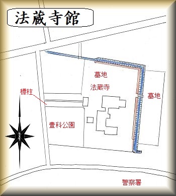 その奥に本堂と庫裡がある。館の遺構かと思われるものは、本堂の背後にある。墓地を通って本堂の東側に入り込んでいくと、そこに水路が通っているのが見えてくる。この水路は法蔵寺の北側から東側にかけて通っているもので、かつての堀の名残なのであろう。内側は若干高く、土塁が存在していたような痕跡がある。