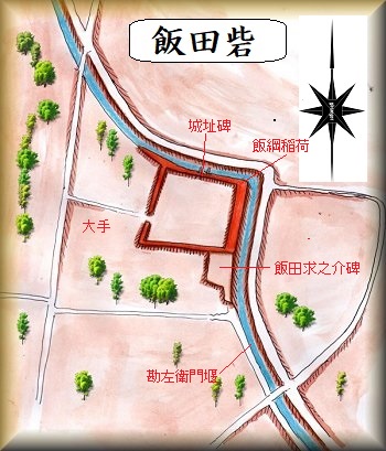 安曇野市豊科高家292番地の辺りが飯田砦の跡であり、googlemapにも掲載されている。城址の北側から東側にかけて流れている勘左衛門堰が、かつての堀の跡であったと思われ、現在も豊富な水量が流れている。