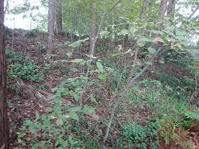 | 西側に建てられた大手道の碑。 | 砦の土塁を内側から見たところ。城内はヤブだらけで、見通しは利かない。 |