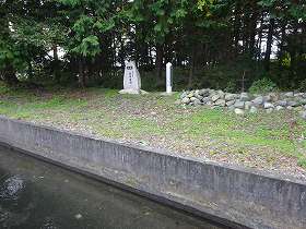 | 北側の土塁上に建てられた城址碑。 | その手前の勘左衛門堰。 |