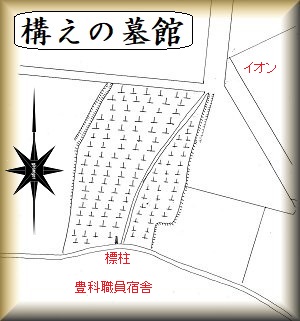構えの墓館はイオン豊科店のすぐ南西に隣接した墓地にあり、googlemapにも掲載されている。航空写真を見てみると、全面が墓になってしまっている。「構えの墓」とは変わった名称だが、この墓地のことを指しているのであろうか。館があったころから「構えの墓」などと言う呼び方をしていたとは思われない。