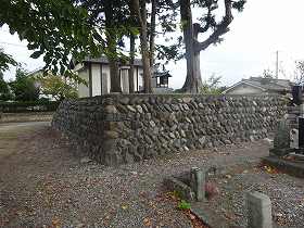 | 金龍寺背後にわずかに残る土塁。 | 土塁上の三峰神社の脇に建てられた城址標柱。安曇野市はこのような居館跡にもしっかりと標柱を立ててくれているのでありがたい。 |