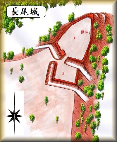 あずみのフルーツランドの東400mほどの所にあるリンゴ畑が長尾城の跡である。台地が北東側に細長く伸びた地形の先端部分を利用したもので、東側は比高10mほどの土手となっている。台地基部の側に堀と土塁を築き、さらに馬出状の2郭を配置した2郭構造の城郭であったらしい。