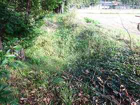 | 土塁の上に立つ城址標柱。 | その北側の堀跡。 |