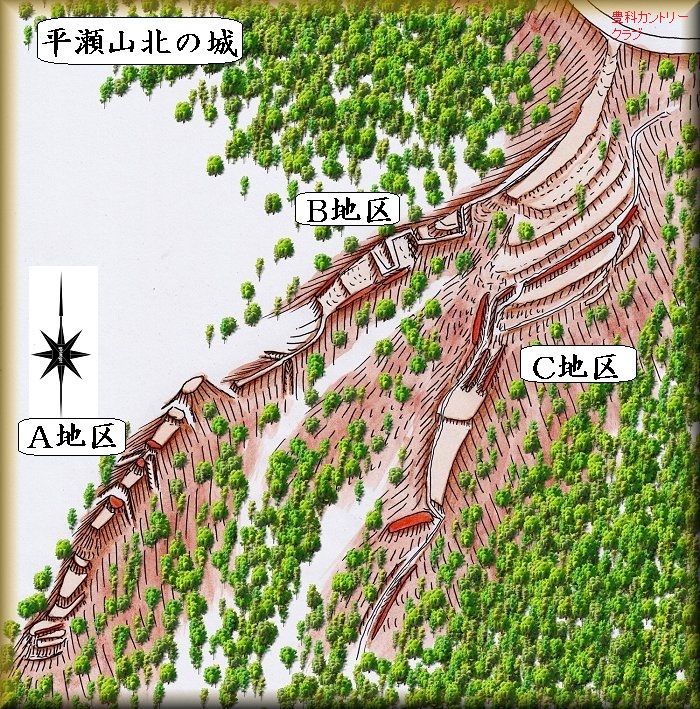 また南側の尾根のC地区も平瀬城から北側に登って行く際の通路であったと考えられる。こうして2つの城からの通路が尾根上に向かっていたということになる。