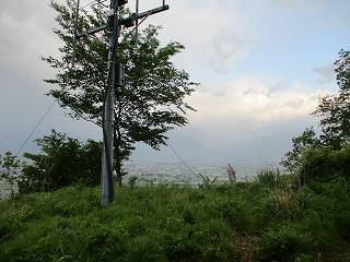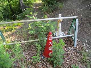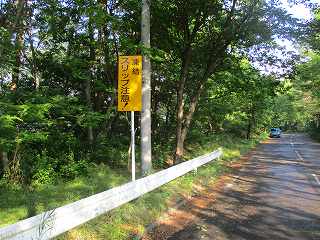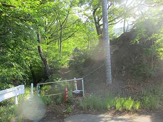 | 松本市との境界辺りでガードレールの切れるところ、この黄色い看板の辺りから入って行くと、北の城へと続く尾根にアクセスできる。 | 北の城に続く尾根。 |
