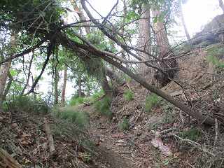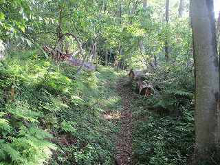 | 堀切の二重目から1郭城塁を見る。 | 5郭南側の堀切。倒木で埋もれている。 |