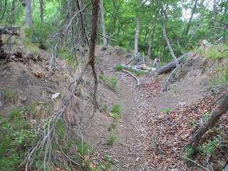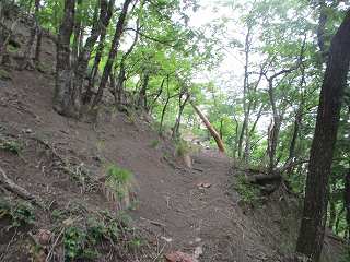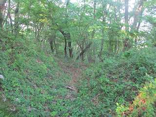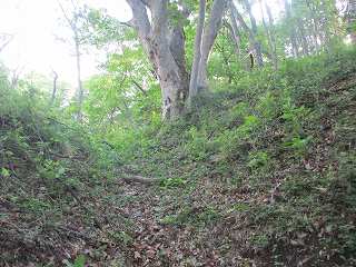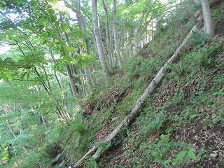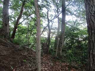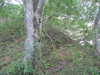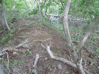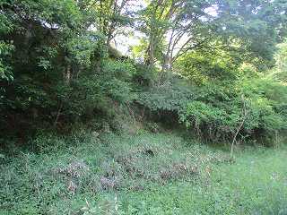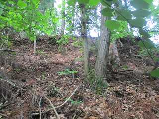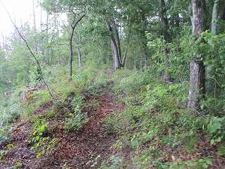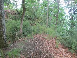 | その北側の鞍部。 | 鞍部の西側の城塁。鋭い急斜面となっている。 |
