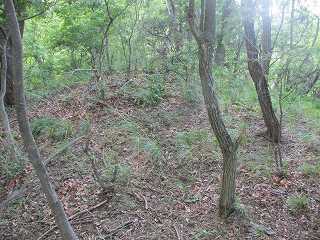 1郭の北側に腰曲輪があり、その先の斜面を降って行ったところが鞍部となっている。堀切と呼べるほどの鋭さは欠いているが、これが城の北側の区画となっていたものであろう。