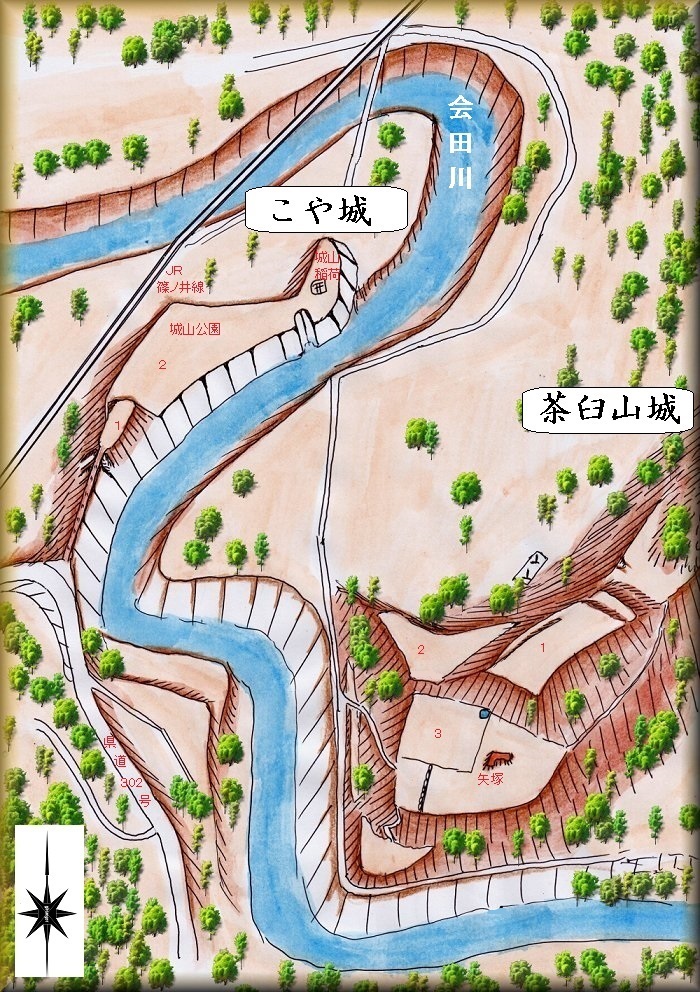 一方、茶臼山城は、こや城の南東250mほどの所にある。こや城からはかなり近い位置であるが、会田川が流れているため、直線的にアクセスすることはできない。茶臼山城に近づくためには、かなり北側から回り込んで行く必要がある。
