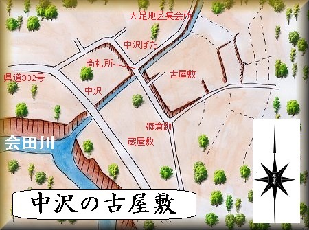 中沢古屋敷は、大足地区集会所のすぐ南側の位置にあった。「古屋敷」という地名が残っており、かつて居館があったところと推定されている。
