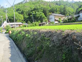 | 城址の北側の民家脇から見る茶臼山城。ここからの比高は30mほど。木がなければ茶臼のように方形の形をした山であると思われる。 | 3郭側面部の城塁。 |