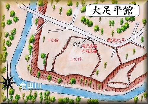 大足平館は安曇野市明科中川手6731番地の南側の河岸段丘上に築かれていた。会田川が南側を巡るように流れており、これによって形成された河岸段丘を利用した城館であった。
