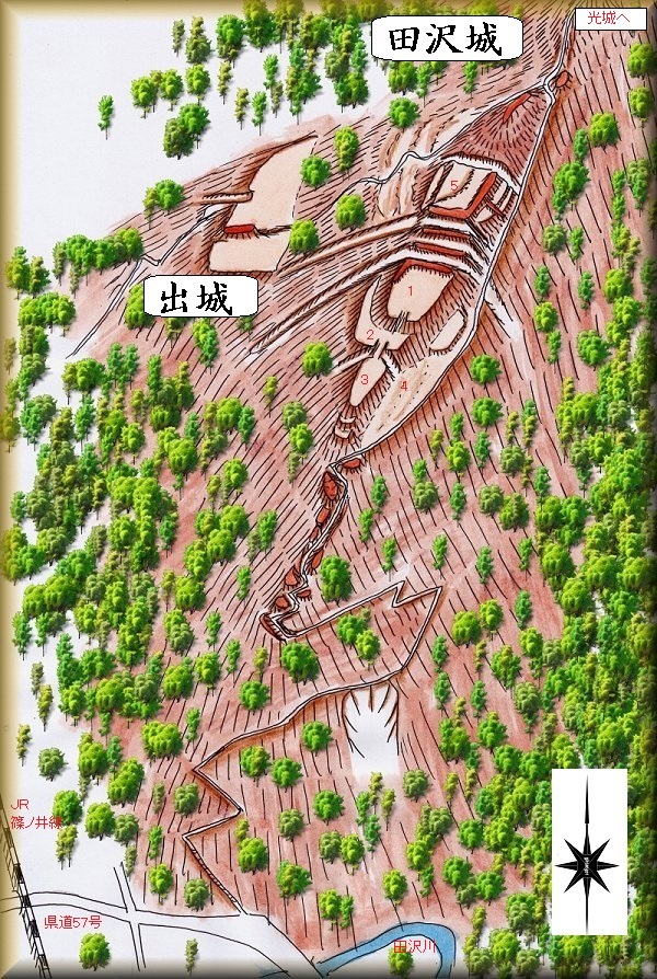 田沢城は光城に上る途中に築かれている。光城への登城道を守備するための支城であったことは、位置関係からして明らかである。ただし、支城としては、それなりにしっかりと構築された立派なものである。