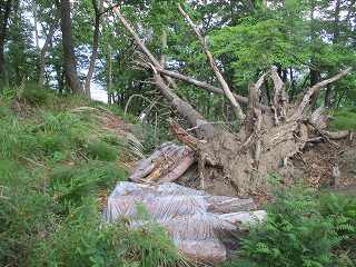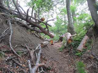 この3重堀切を越えていったところが5郭である。5郭はヤブこそないものの、全体に切られた木が散乱しており、とても歩きにくくなってしまっている。城址整備のために木を切ったものなのであろうか。だとすると、まったく逆効果である。切った木をそのまま郭内部に放置していては、城内を荒らしているだけのことになってしまう。とにかくここから北側の山稜にかけては倒木が多すぎて閉口する。