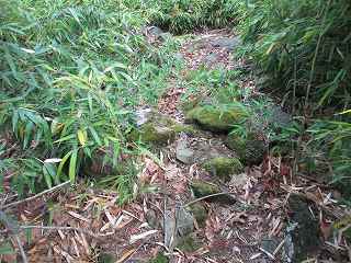 すぐに登ったところが3郭でここにはアンテナが建てられていた。ここから北側の2郭、1郭を目指していくのだが、2郭と1郭はまったく整備されておらず、まるごとヤブに埋もれてしまっている。ただ、2郭の虎口・1郭の虎口にはそれぞれ石積みが残されているのが分かった。
