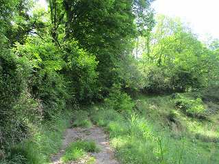 | 民家の入口を過ぎるとこんな道になる。車で進んで行こうとしたが無理だった。軽の四駆以外は進入しない方がよい。素直に歩いて行った方が無難。 | 1郭南側の尾根下の道。 |