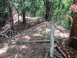 正面の尾根を進んで行くと、小規模な堀切が見えてきた。この方向の尾根には合計3本の堀切が入れられている。3本目の堀切を越えて登ったところが1郭である。