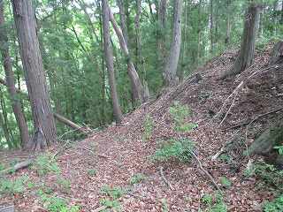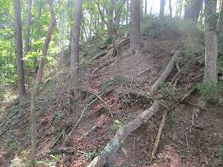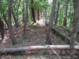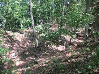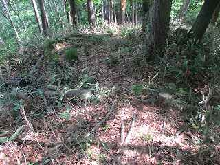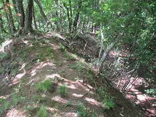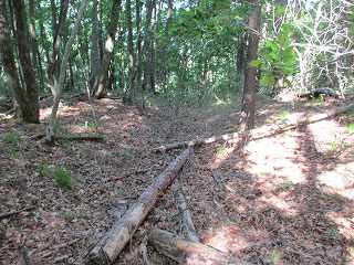 尾根道をそのまま道なりに進んで行くと、道は三峰城の東側の尾根の先端部に合流する。この部分から1郭方向に進むのが楽である。途中にはやはり3本の小規模な堀切が構築されている。