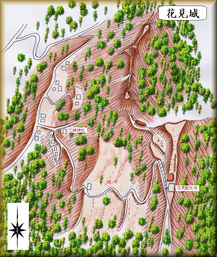 というように見てくると、花見城で郭らしいものは1と2くらいだということになる。しかし1にしても堀のような人工的で明確な区画は見られない。本当にこれが城なのかどうかも疑問に感じるところであるが、城だったとしても、自然地形をそのまま利用した簡素なものであった、ということになる。
