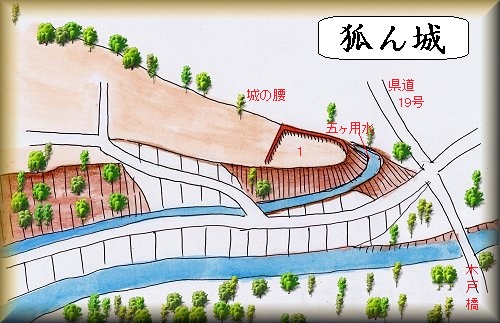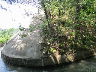 | 狐ん城の側面部。コンクリート加工されているのでとてもよじ登れない。 | 先端部下から取り付いてみた。ところが中腹部に五ヶ用水が取り巻いていて、渡ることができなかった。 |