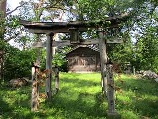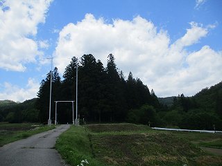 | 林道を進んで行った先にある天田山神宮の入口。路肩にかろうじて駐車できる。 | 天田山神宮。 |
