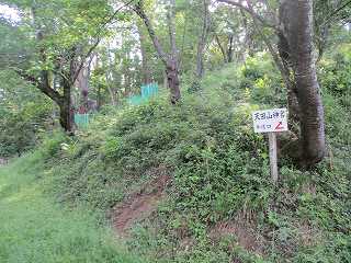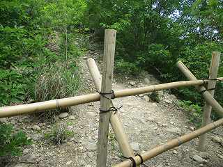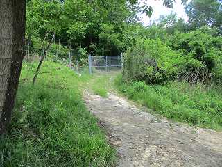 神社の左側を通って進んで行くと、城内方向に進入していく道の分岐点がある。この場所である。柵があるので柵を開けて入って行く。