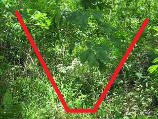 | 1郭から南側に尾根を降りていく。右側の下には2,3といった広い郭がある。 | その先にある馬屋の窪。天然地形であろうが、巨大な横堀のようにも見える地形となっている。 |