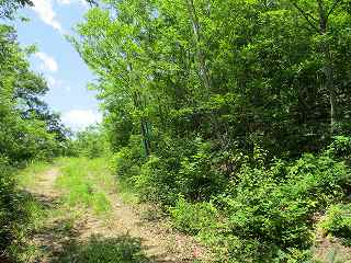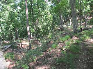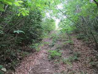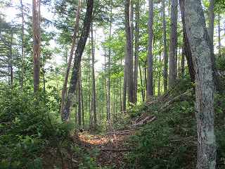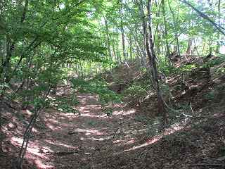 | 最初に見えてくる堀切。 | 林道は尾根を切り通すように通っている。。 |