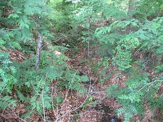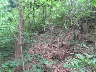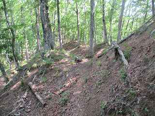 | 横堀状遺構を過ぎてさらに尾根を進んで行った先が三峰城である。 | 東側の堀切。浅い堀切が3本ある。 |