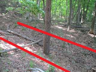 | 北側の尾根を進んで行くと、三峰(さみね)城との間に横堀状の地形が見えてくる。 | 横堀は尾根に平行に3本掘られている。 |
